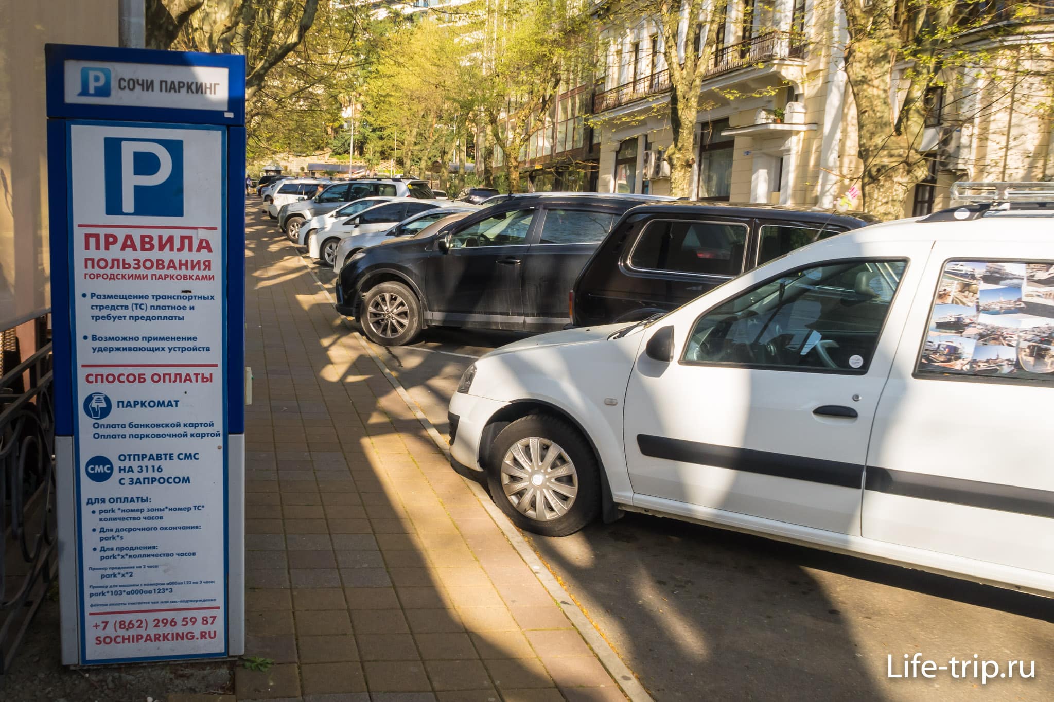 Оплата через мобильное приложение «Парковки Сочи» или паркомат.