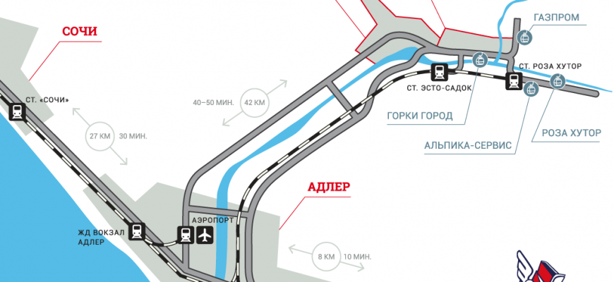 Самый быстрый способ – сесть на «Ласточку». Электрички отправляются со станции «Аэропорт Сочи», которая находится в пешей доступности от терминалов.